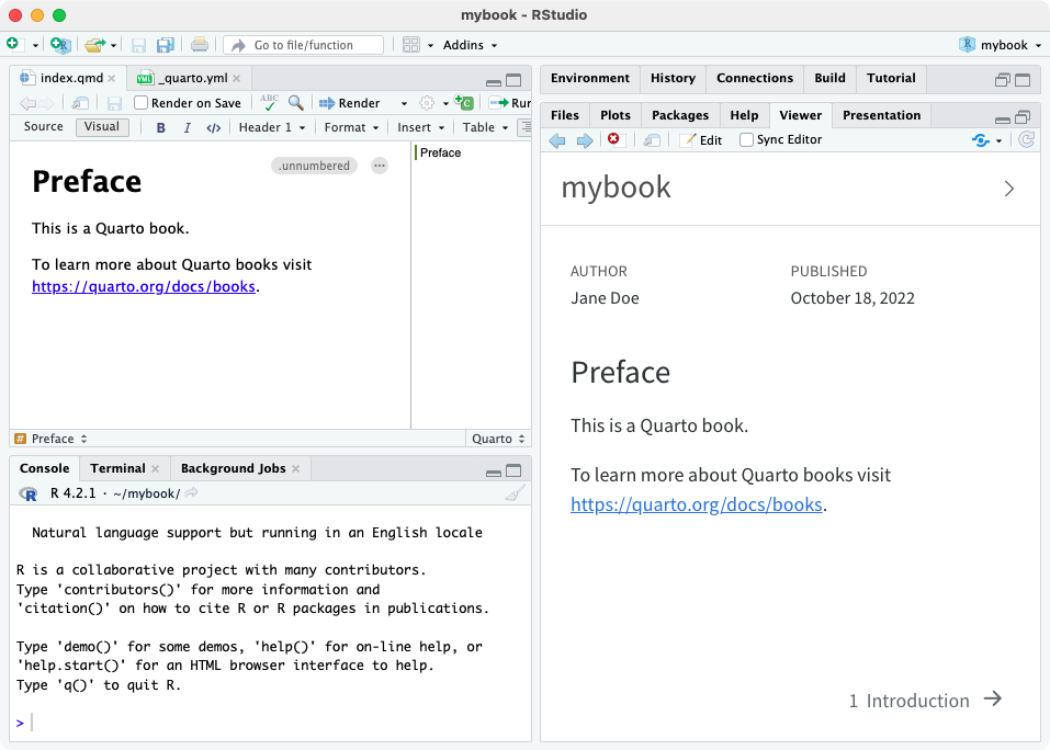 quarto create project book mybookThis will create the scaffolding for a simple book in the mybook sub-directory. Use the quarto preview command to render and preview the book: